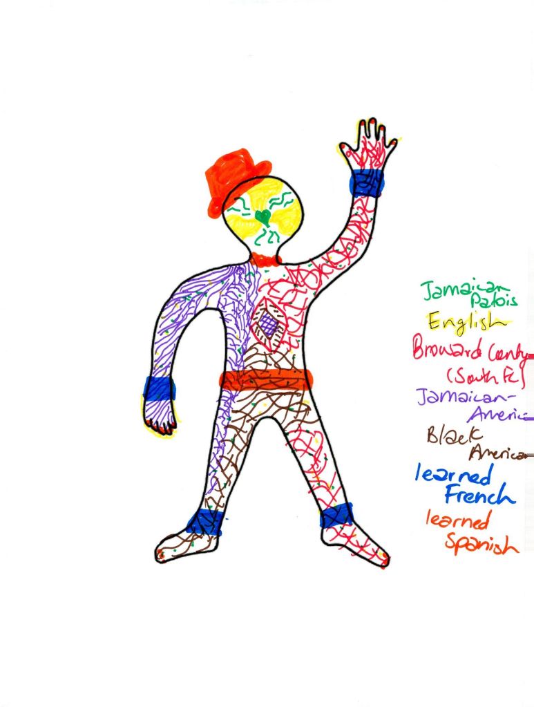 Eralia chose yellow for English and green for Jamaican Patois, because these two colors were from the national flag of Jamaica. She colored the head in both yellow and green because she always used these two languages together, but the green heart in the middle of the head showed that Patois was deep-rooted in her mind. She highlighted both hands in yellow because English was the language she used to interact with the world. Eralia reserved her favorite color, purple, for half of the body to represent her Jamaican identity, and then she used red for another half of the body to indicate her hometown, Broward County in south Florida, which represented her American identity. And then Eralia inserted brown for one leg to represent her Black American identity. Because she felt that she had been “integrating” her different cultures, she drew a gemstone in the middle by including all the colors that represented Jamaican, American, and Black cultures (Focus group interview). The yellow and green dots all over the body meant that English and Patois were the languages through which she experienced her cultures. In the individual follow-up interview, Eralia decided to add Spanish and French into her language portrait. She used blue, one of the colors in French national flag, to draw bracelets and anklets to represent French. After some thoughts, she selected orange to contrast with other colors for Spanish, represented by the hat, necklace, belt, and the fingernails.