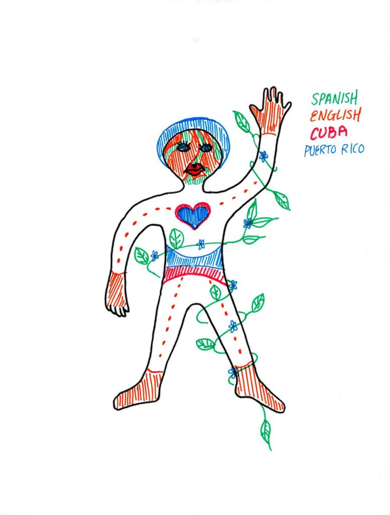 The orange dotted lines were leading to the heart in red and blue. Red symbolized the Cuban culture from Clara’s father side and blue symbolized the Puerto Rican culture from her mother side. These two colors created the national flags of both countries. The contrast of the colors indicated that she had very different experiences growing up in these two cultures. The heart was mostly in blue because Clara loved her Puerto Rican heritage which constructed her core identity. She also colored eyes in blue and added a blue halo around the head because she thought and saw the world in the way her maternal family brought her up. In contrast, Clara only added a small red line around the blue heart because she felt less associated with her Cuban family. She colored her mouth in red because she had “Cuban temper”, which was a synonym to hot temper. She combined red and blue in the stomach area because she was craving for Hispanic food.