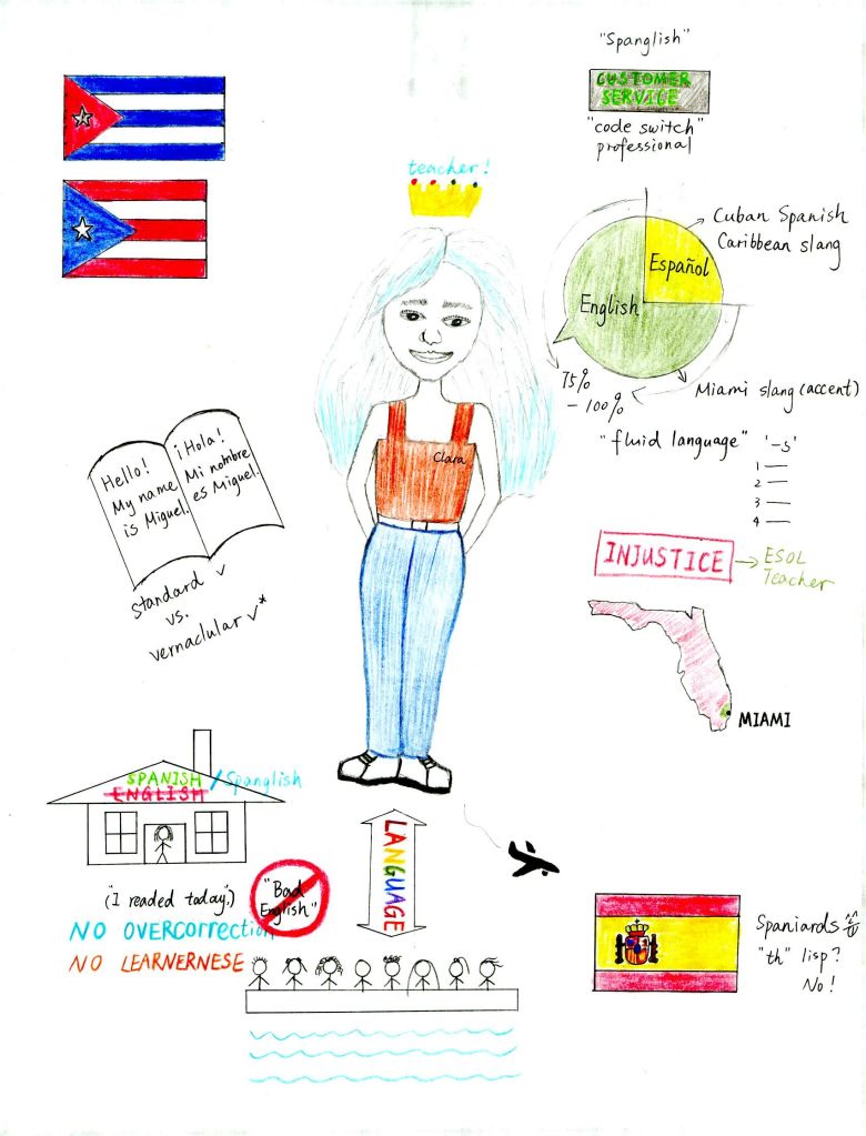 Clara was most satisfied with the green vine with blue flowers she added to her language portrait. She believed that her Spanish language ability and Puerto Rican heritage were what she was “proudest of” and made her “most beautiful”.