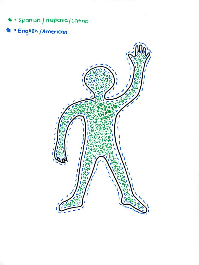 Belicia used the green dots to represent her Spanish language and Hispanic/Latino culture and blue lines to represent her English language and American identity. She chose green because she was thinking of the national flag of Mexico, where her parents were originally from. Likewise, she chose blue because she was thinking of the national flag of the United States, where she was born and grew up. She thought of red as well, but green and blue were the colors that only existed on one of the flags, respectively. Belicia explained that she used dots to create a more “coherent” object, and her Spanish language and Hispanic/Latino culture were “sporadic” in her. The lines outside the body formed a layer that made people only see the “surface and superficial” level of her as an American English speaker.
